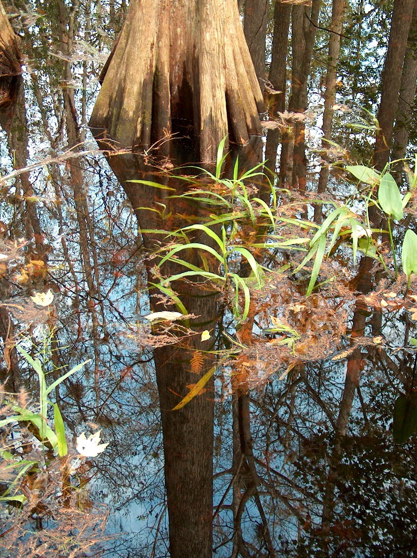 Much of the land is covered by dark, tannin coloured water mirroring the overhead world and creating a magic, sound absorbing swamp where the silence is occasionally broken by the insistent tapping of woodpeckers or their piercing territorial calls. The Cypress trees with their buttresses and surrounding "knees" stand incredibly tall and straight in this soggy ground, their trunks brushed by lower level vegetation. In places, the slow inexorable flow of water is just evident while elsewhere the surface is unbroken by movement. Wooden walkways allow passage through this land that time has forgotten and into a world dominated by the fecund growth.