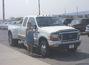 The following Saturday we picked the truck up and some of you will recognise the picture of the beast, with the life size Teresa dwarfed next to it. I have never thought of myself as small but have had to reconsider my self-image since buying this monster. It has to be acknowledged at this point that most English cars, and roads, are built on a different scale than American ones - it being a small island. Consequently I had never driven a tank replica on public streets or anywhere else for that matter. Needless to say the very prospect of trying to manoeuvre it in small towns and car parks filled me with fear. It also quickly became apparent that Ford did not intend women of just above average height to drive their manly vehicle. With the seat as far forward as possible I can just reach the pedals but my knees are up against the fascia under the steering wheel. The gear stick is as long as a yard-arm and only a daily Popeye size portion of spinach will ensure the strength to shift it. It wasn't plain sailing for Sterling either. It took us both a good month to feel anything approaching comfortable with it and luckily we didn't hit anything or anybody in that time.