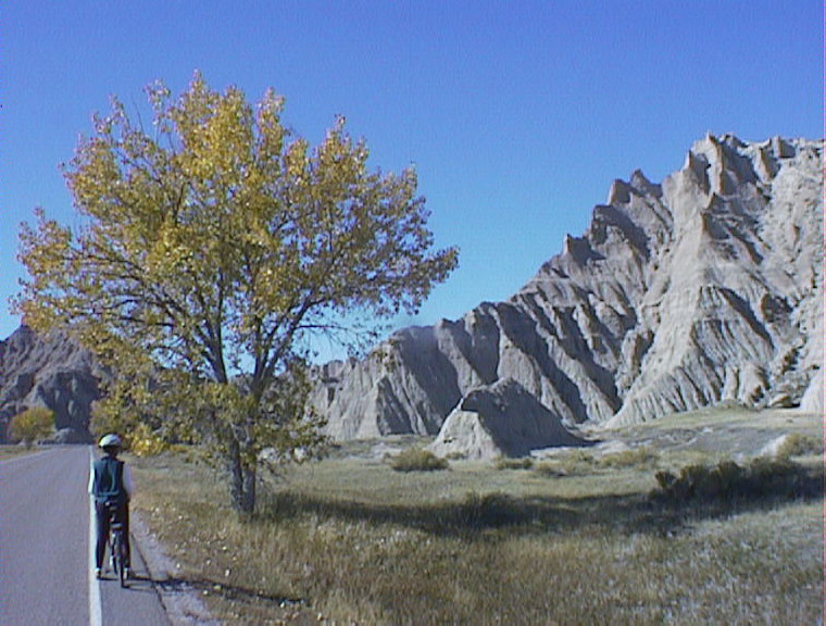 One of our last stops in South Dakota was at Badlands National Park where we managed to fit in some cycling and walking in the bare, stark moonscape. Out on the bikes we had an encounter with a small rattlesnake that was intent on remaining coiled up on the warm black tarmac of the main park road. Sterling went into rescue mode but the snake held it's ground and knew it had the better of us. We weren't going too close and he just continued peering at us from the centre of the coil and making the usual threatening noises. Sterling attempted to use the matador approach with my wind shell but I expect being green, it was the wrong colour. We rode off in the end hoping he would move quickly if a car came along.