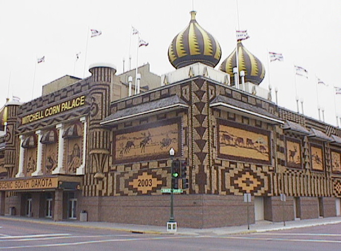 Mitchell, South Dakota boasts the Corn Palace, a piece of American kitsch that defies explanation. South Dakota is not the corn centre of the world but perhaps that is where their aspirations lie, so that each autumn, they decorate the Palace with husks and sheaves creating scenes from white American western history. Cowboys, bison, deer and pheasant feature strongly in a tableau crafted from the crop. To say it is corny is to do it an injustice and approaching the town, the billboards stun with adverts such as "You'll be a-maized" and "We're all ears".