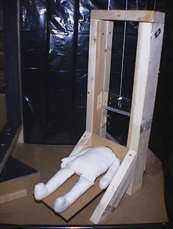 is found by following a strip of low-key lighting on the floor, down a dark corridor constructed to guide you to an enclosed area viewable through a clear Perspex front. An activation switch is reached by putting a hand in another very small, contained area, within the box, where all that is visible is the switch itself, which illuminates the guillotine once it is depressed. The guillotine blade begins to move. If the button is released everything stops thus encouraging the participant to keep their hand in the box. The illusion of being in control continues for a few more seconds but then the blade suddenly drops and synchronistically a belt smacks down onto the wrist. The unfortunate figure under the blade shudders and as the shaken guest turns to leave, a life size ghoul suddenly reaches out to grab them from the dark recesses. My description and photographs cannot begin to do justice to the sophistication of the entire work, operated by a computer program that Dave builds to control the system. Unfortunately, Sterling and I couldn't stay for the party but had great fun helping with some of the more minor aspects of construction.