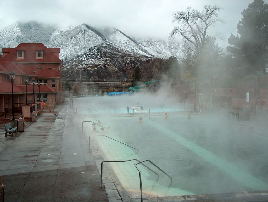 On the way over the mountains, we stop in Glenwood Springs, our home prior to taking to the road. If and when we return to living in a house glued to the ground, Glenwood is one of the few places that we'd consider: maybe not the town itself but somewhere not too far away, in easy reach of the Springs. The town sits at the confluence of the Colorado and Roaring Fork Rivers nestled in the bottom of the narrow valleys. At this time of year we used to watch Bald Eagles sweeping along the river and during especially cold spells, plates of ice floating by on the water, ferried by currents while the air above swirled with wisps of mist in the early morning. Over the weekend we play at tourists. A visit to the Hot Springs is obligatory and reminds us yet again just how much we miss these wonderful waters.