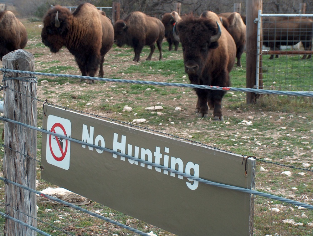 No Hunting the Bison While I hesitate to jump to conclusions about an entire state based on a few chance observations, sometimes it's hard to restrain myself. Along the interstate, an oft-repeated billboard advertised: "Wildlife Ranch - African Safari, Texas Style". The pictured giraffe looked a little confused and images of cowboys, lassoes and long necks meandered across my mind only to be disturbed when we stopped at a State Park, advertised as a wild turkey roosting habitat, to find that it had been closed for a two week hunt. Suddenly the word "safari" took on a whole new meaning that was confirmed by a "No Hunting" sign on a field of farmed bison within another state park's boundaries. We speculated about why such a notice might be necessary and the possibilities we covered were not altogether pleasant.