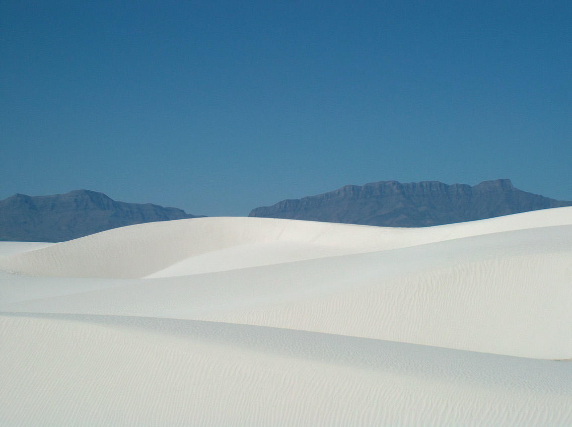 On calmer days, the voluptuous interlocking curves of the white sand dunes lie beneath the cerulean desert sky against the hard lines of the surrounding dark mountains in a tableau of natural dramatic contrast. It is a place of rare beauty creating a deep pleasure in the heart and a playfulness brought about by so much sand. Shadow and light create a multi layered blue-hued tapestry stretching into the distance, defining the gently rotund dunes and highlighting the distinct pencil line curve of the crests.