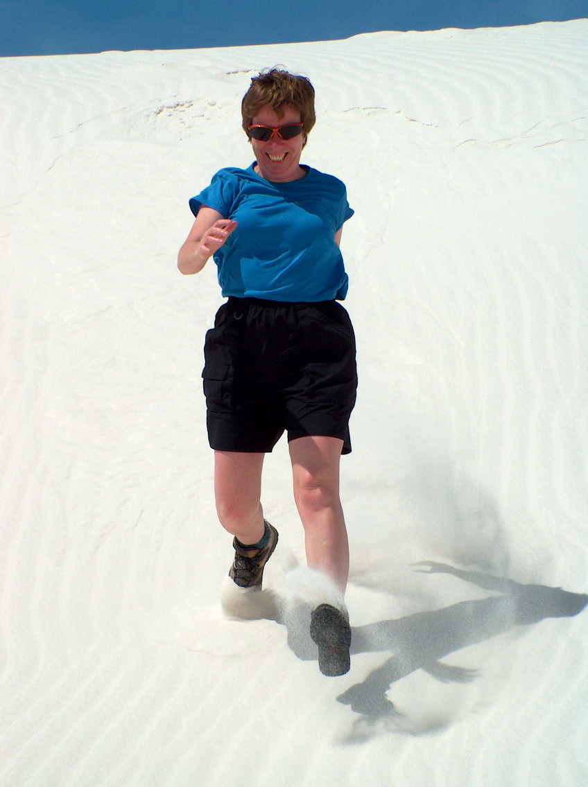 In the centre of the field, vegetation is confined to the inter-dune areas leaving vast curved surfaces marked only by wind ripples and occasional animal tracks. The Alkali Flats Trail goes out across this sea of sand in a loop just over four miles and normally we would view such a distance as a gentle afternoon stroll. However, having had experience of dune walking, we were not so gullible and knew what to expect. Sure enough, there were slopes of deep soft sand determined to devour all momentum, engulfing and filling our walking boots with each step and demanding more energy than a thousand foot climb. The views at the tops would have been breathtaking had it not been for the fact that we were invariably gasping by this stage.