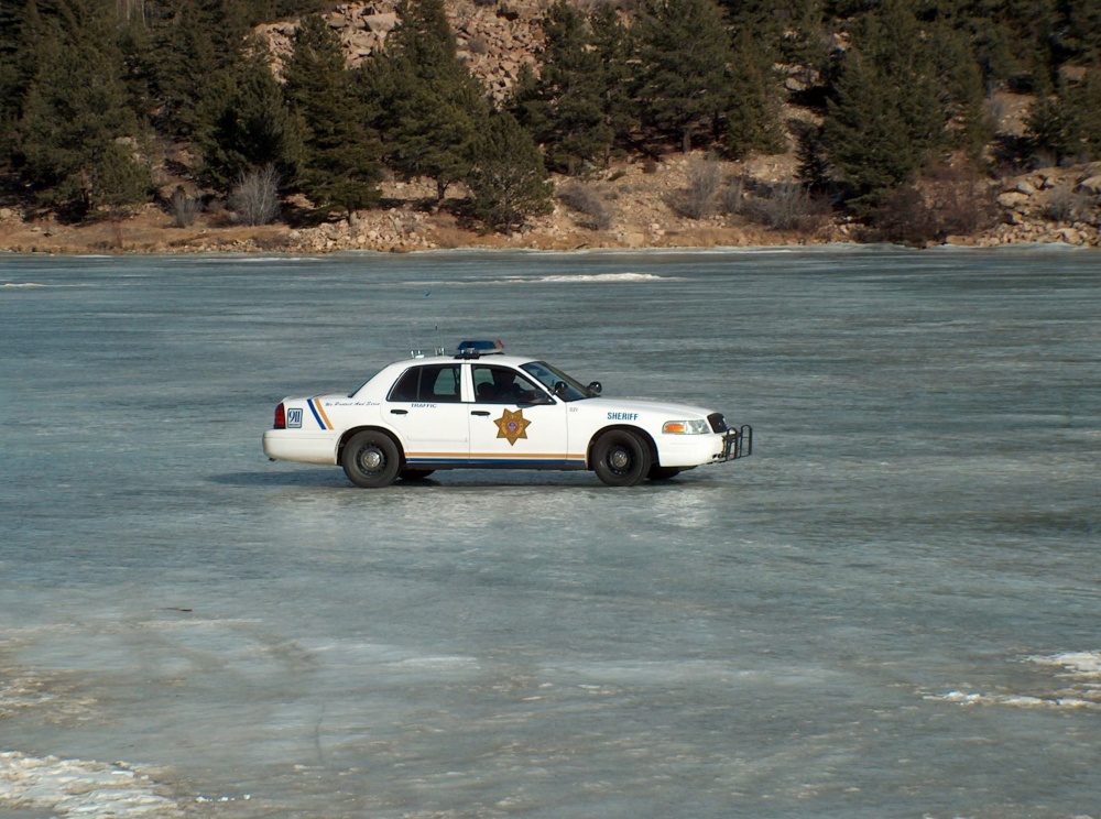 There is a small lake just outside the town that freezes to a considerable depth in the winter, and the Denver police forces use it to practice their driving skills. The juxtaposition of the "DANGER - THIN ICE" sign and numerous police cars skidding, skating, slipping and sliding over the surface is a little concerning although they maintain that the ice was eighteen inches deep and perfectly safe.