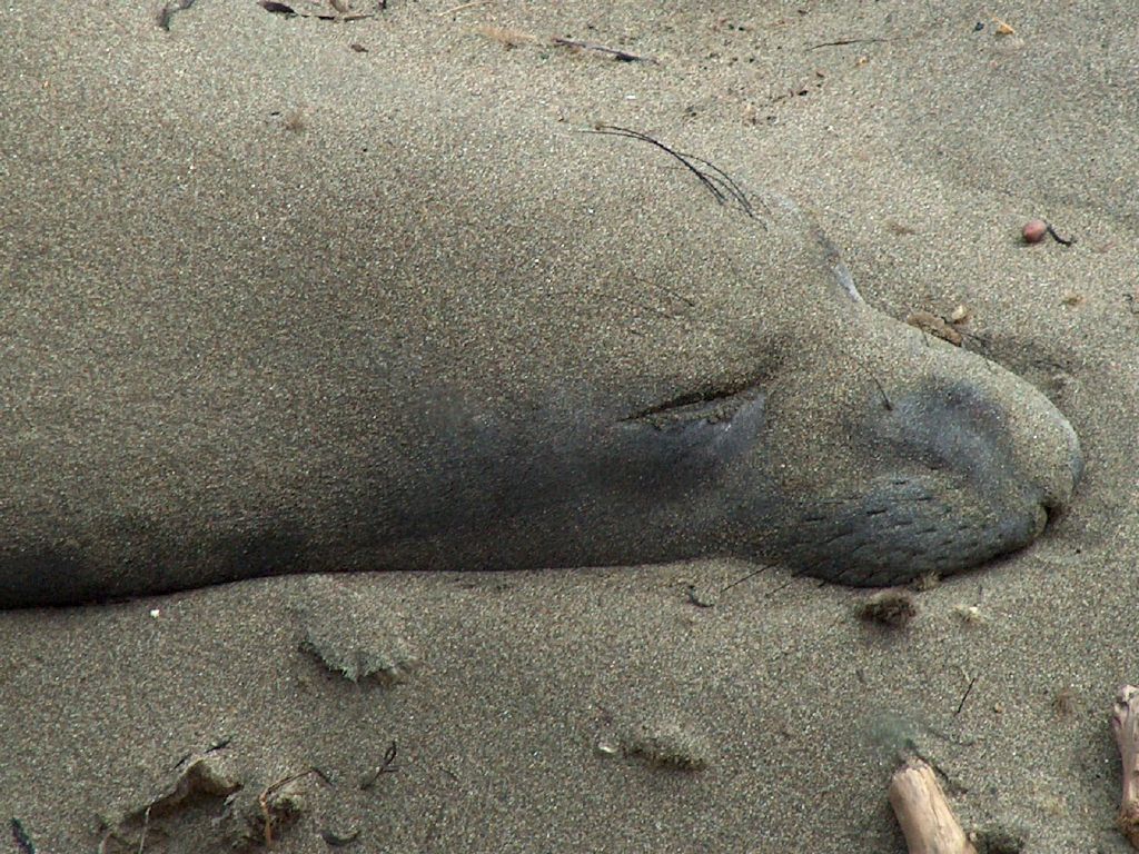 A gentle smell, reminiscent of liver, wafts up from the beach at Piedras Blancas where hundreds of Elephant Seals have hauled out to moult. They lie higgledy-piggledy, curved around and against each other, their moulted fur littering the sand. They are masters of the art of total relaxation, whiling away time in a semi comatose state only rousing themselves to flipper sand onto their own backs and into their neighbours faces. As all young children know, rule number one on the beach is No Throwing Sand, but the seals are oblivious to this and impervious to face fulls of sand, flipper or tail. Notions of personal space do not exist in this intensely gregarious colony. Stirred from their slumbers, individual seals occasionally set off across the beach in a surprising burst of energy, travelling over and through groups of their cousins, before just as suddenly grounding to a complete halt and resuming their dead beast impersonations. Others lie dozing with one flipper held up in the air, the little nailed tips curved over, the strain of keeping that last inch vertical just too much effort. A few immature bulls remain with the colony, honing their skills in the posturing department, raising their huge bodies to full height and generally making sure everyone knows they are there while the sound of snotty snores emanating from the slumbering majority continues in the background.