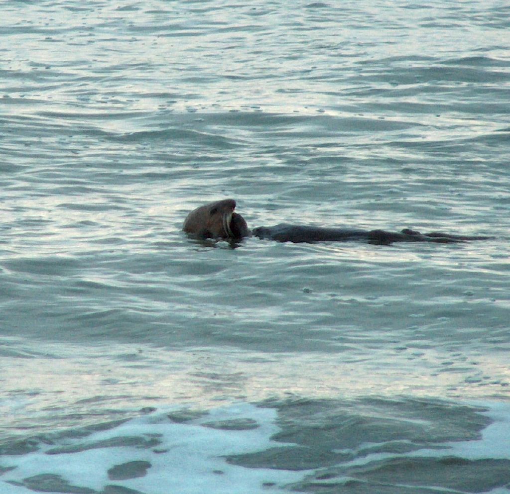 We had come up to the small seaside village of Cayucos to spend a couple of days with friends holidaying on the coast and there we were treated to the sight of a Sea Otter having a prolonged and leisurely dinner in the shallow waters of the bay. Our presence on the beach piqued her curiosity and a few times she appeared to take an appraising look in our direction. Otherwise she was intent on the business of feeding, disappearing beneath the waves to surface a while later, lying on her back busily working open the captured goodie with her dexterous little fingers. We weren't sure if she was particularly thin or if her appearance was indicative of the physiology of otters, but either way her ribs and spine were clearly visible through her dense coat. Given the success of each dive it's hard to believe she was going hungry.
