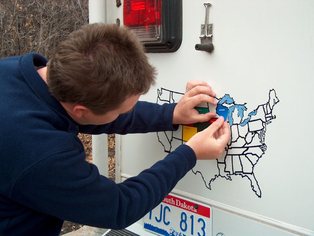 Unfortunately this little hobby is showing signs of getting out of control. We have abandoned any semblance of good taste and have applied a map outline of the States onto the outside of the camper. The map comes complete with brightly coloured cut outs of each state that we can put in place once we have been there. This of course raises the issue of what it means to visit a state. For instance, are we allowed to put Arizona in it's rightful position just because we clipped one corner of it in February? These and other world relevant and metaphysical questions are debated hotly around the campfire.