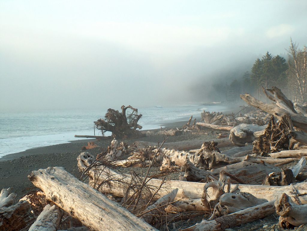 Sea mist envelops the land, drifting and swirling in its passage over the sands and into the backdrop of pines. Whole tree trunks, carelessly tossed up by the might of the waves, lie scoured and bleached by the elements, haphazardly arranged over and across each other creating considerable barriers in places. The power of the water is clearly evident and although relatively calm during our visit was still audible from Mora campground, two miles away.