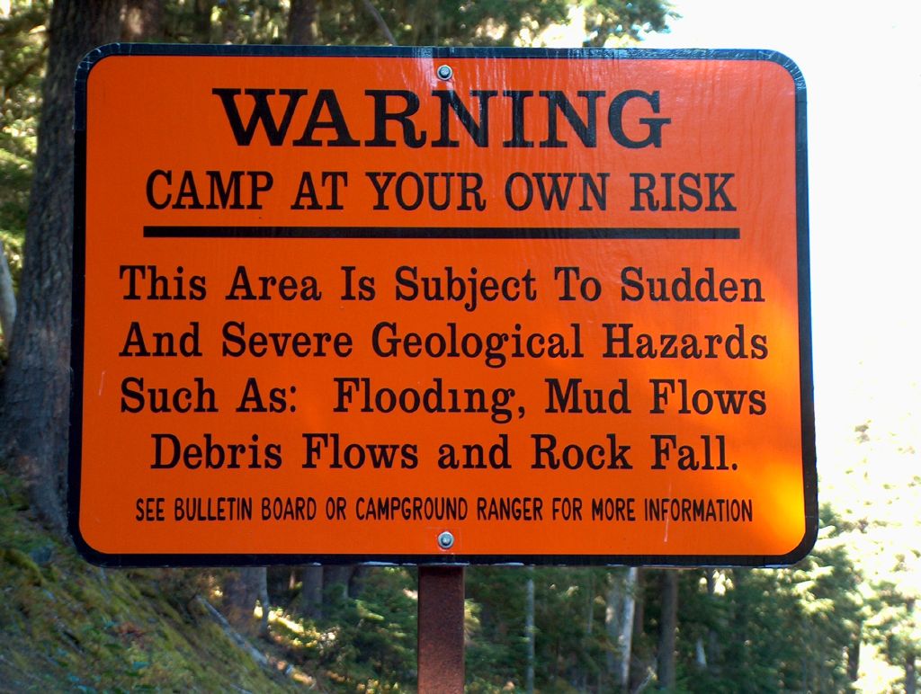 The Park Service disowns any responsibility for your safety whilst camping in Mount Rainier National Park. Warnings regarding cataclysmic geological hazards abound in the campgrounds and as Sterling observed, merely being here rated 2 on the Adventurometer. Given this is an active volcano not far from the infamous Mount St Helens; there is some argument for taking serious note of these signs. In the event of hearing a noise like an oncoming train, one is instructed to run up the valley side to a height of at least one hundred and sixty feet, without delay. This isn't you understand the volcano erupting but just one of the minor hazards such as a twenty foot wall of water and rock hurtling down the valley at frightening speeds, the result of glacial melt. Picture the scene: we're warm and toasty in our bed, oblivious to the world except for dreams of dogs wearing flip-flops. Through the layers of consciousness comes the sound of a freight train bearing down on the yelping hound whose progress is hindered by his foot-ware.