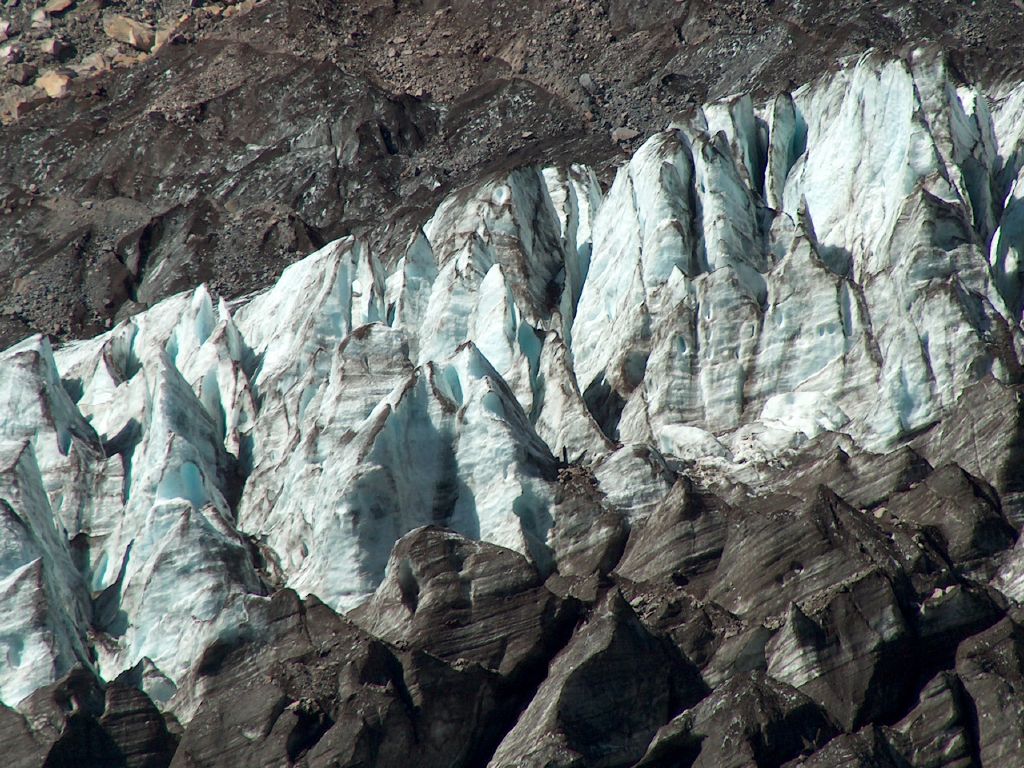 Here the ice is clearly visible, it's deep peaks and crevices obvious, sections blackened with the rock gouged out by the ferocious power of its inexorable movement. More amazingly, the sounds of the ice cracking as it inches forward are clearly audible as are the numerous melt streams emerging at the leading edge.