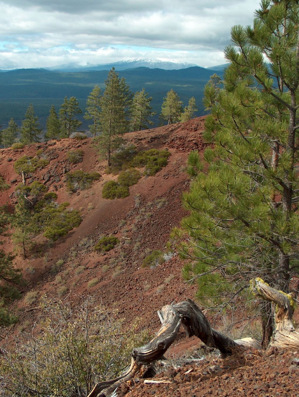 The landscape south of Bend is dotted with cinder cones built on the flanks of the volcano interspersed with lava beds and swathes of evergreens. The black rock of the beds lie in a broken jumble, bare save occasional patches of lichen and the odd stunted pine struggling to reach eighteen inches. The visitor centre for the Monument lends access to a short road spiraling up Lava Butte, a large red and black cinder cone. A short walk at the top follows the edge of the crater, the crunch underfoot characteristic of the small pieces of cinder making up this impressive mound. On the south side, the breach point on the cones flank is visible and from this point, lava poured forth, creating ‘gutters’ to facilitate its own progress out across the valley floor.