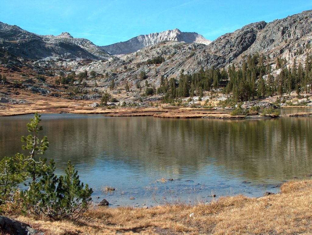 The trail continues across pristine alpine meadows, along several lakeshores, and the banks of mountain streams teaming with fish that dart back and forth at our approach, the whole tableau surrounded by mountains. Flocks of Western Bluebirds perform hummingbird impersonations in their attempt to catch winged tidbits aided by the brisk breeze that they seem to use to their advantage. Although this is a landscape untouched by the rounding effects of the ice leaving the lines sharp and craggy, erosion still continues, washing particles down the hillside into the lakes, building small islands during the silting up process and producing surprising white sandy beaches along the waters edge. It is wonderfully silent, devoid of people and somewhat of a relief after the comparative hubbub of its busier neighbour.