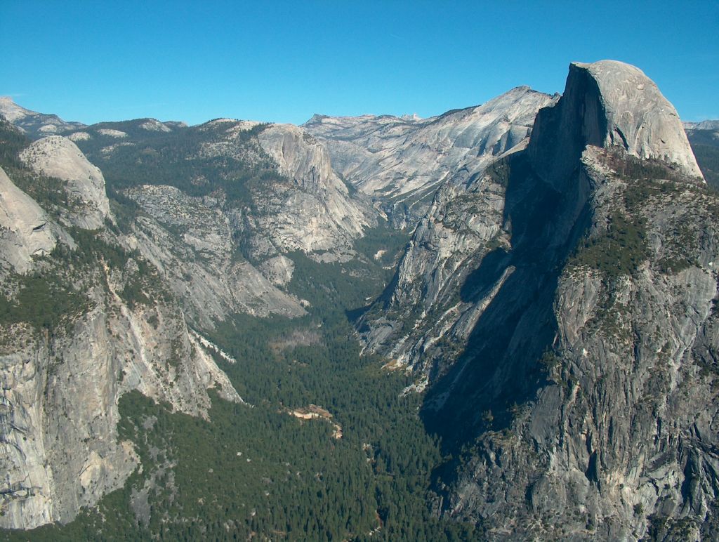 The views along and down into the valley are magnificent, the meadow that we set off from becoming smaller and smaller until finally disappearing far below. Other panoramas open over to Half Dome, back to El Capitan, across to the dry site of Yosemite Falls, and up into Tenaya Canyon. It is worth every step even though the way down proved nearly as hard on the legs although a relief to the cardiovascular system. I have to report that the days following this exertion, the leg muscles staged their protest by refusing to work without considerable moaning and groaning.
