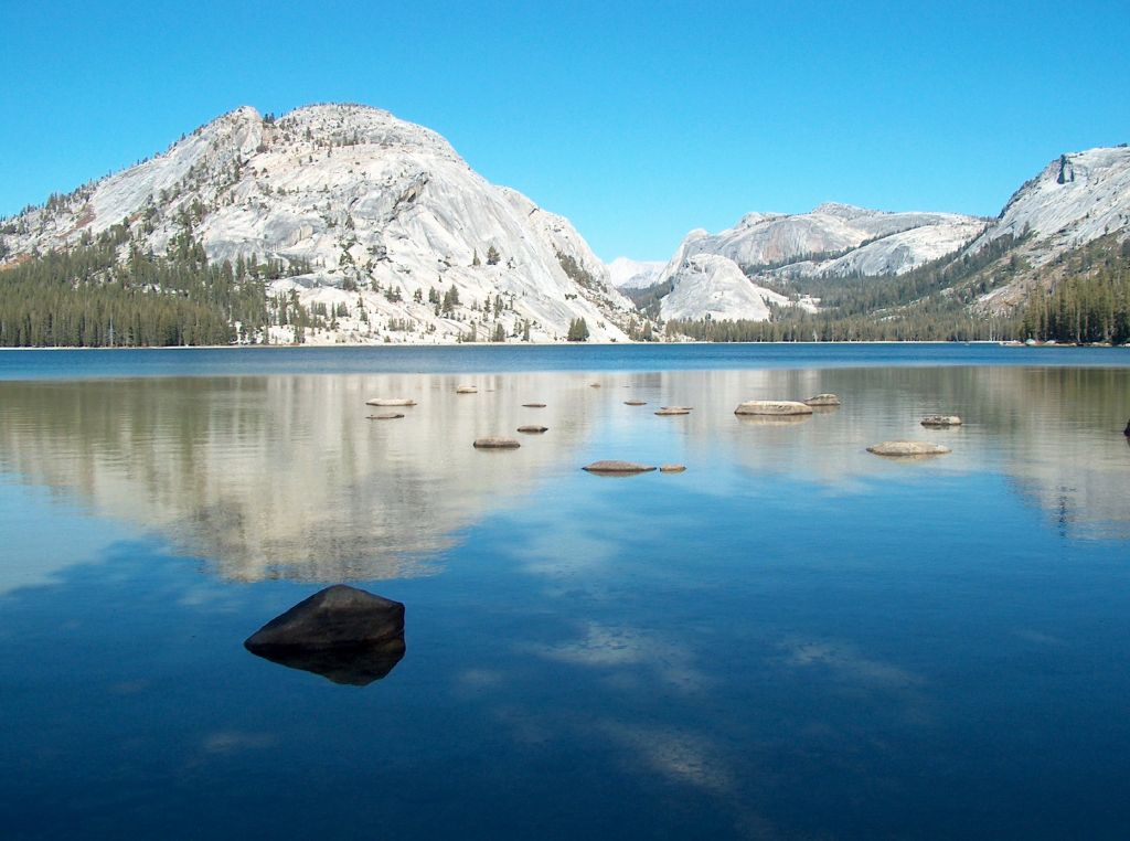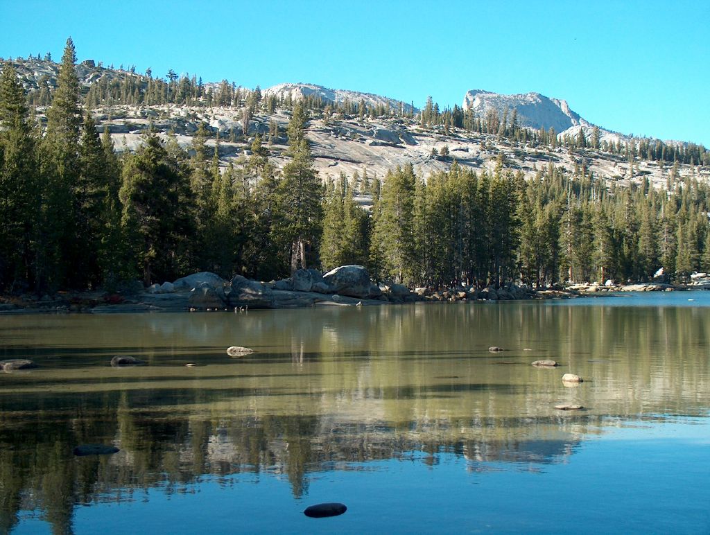 The deep blue skies typical of the mountains are always a wonderful backdrop to any scene and as we entered the Park from the eastern side, the sun shone with unseasonable warmth and the clear air gave a clarity and sharpness. White granite domes dominate the landscape, their rounded forms sculptured by the massive inexorable movement of glacial ice, the surrounding evergreens, skirting below. Steep sided valleys mark the glaciers passage; rocks, polished and scratched indicate it’s direction of travel and the transparent waters of the ribbon lakes reflect the surrounding beauty. A perfectly calm surface and clear water provides a two-way view: into the lake below, and out to the world above, tree shadows adding momentary confusion.