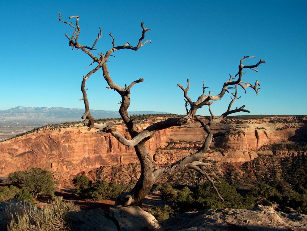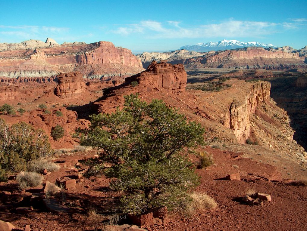 It seemed as though maybe it was time to leave Colorado and besides which, the road into Utah always beckons. We arrived at Capitol Reef National Park to find large tracts of it closed by flood damage following a week of heavy rain. The skies had cleared by the time we arrived and the bright winter days that are so typical of this part of the country had returned. Snow covered mountains were visible in the distance and the various hues of red rock glowed in the winter sun. It's a wonderful time of year to visit: the campgrounds are virtually empty and the chances of meeting another person out on the trails are remote. There is a perfection of clear deep blue skies stretching as a backdrop to the reds and yellows of the sandstone with the dark green of twisted junipers producing oddly shaped exclamations across the landscape.
