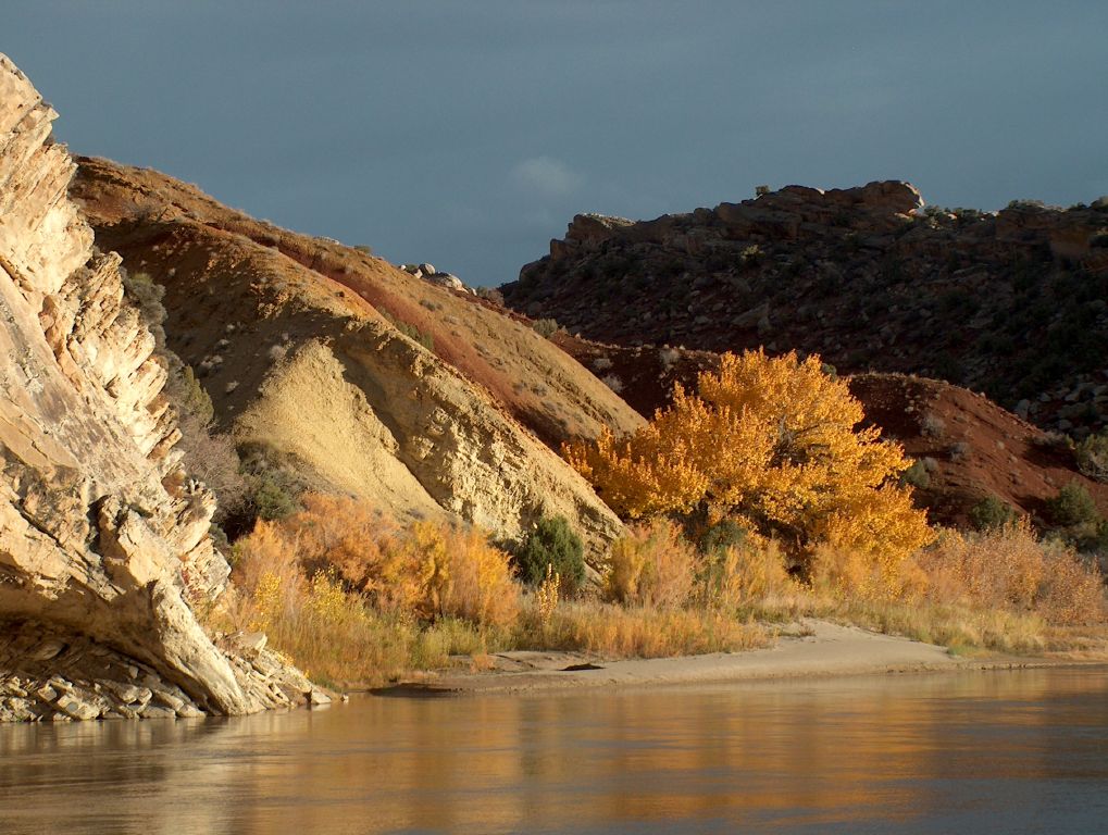 November was an eventful month that started quietly enough with a meander across southwestern Wyoming and a few days at Dinosaur National Monument on the Utah-Colorado border. Many of the more remote campgrounds are closed in the winter months but those that are open are virtually deserted. We parked on the banks of the Colorado River, across from a stretch of multi-coloured strata that became almost luminescent in the late afternoon sun. Many trees had already succumbed to the desire to rest, their leaves strewn carelessly by the winds, but others held on tenaciously to their golden halos, creating an intermittent edging along the winding steel-grey ribbon of the river.