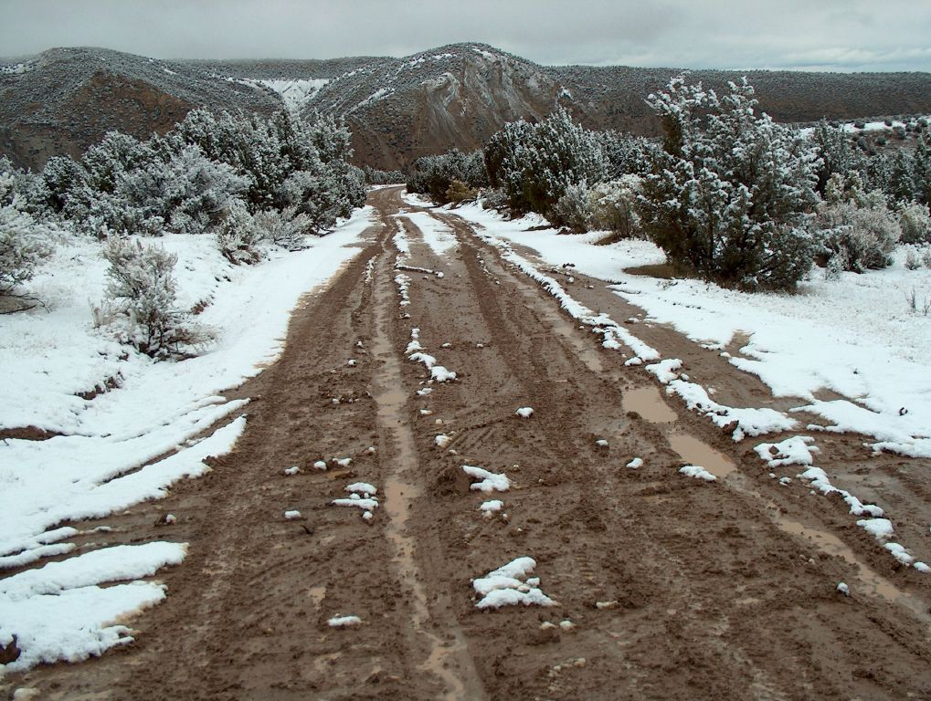 As evening approached, we drove along a dirt track into a BLM area intending to stay there and be away early the next morning. Overnight the heavens opened, the narrow track turned into a quagmire and the minor detail of the ten foot drop off one side suddenly took on a whole new significance. Whatever Ford might have told us about their four wheel-drive trucks and whatever we had believed or hoped, was just not true when it came down to it. The camber of the track along with its slick muddy covering had us sliding dangerously sideways towards the drop off. I'm convinced that it was Sterling's amazing driving, coupled with a small miracle that kept us largely on the alleged road. We crept along until we realized that the gradient was about to increase significantly in a downhill direction and having walked ahead to see how the land lay we decided we just weren't going to make it out.