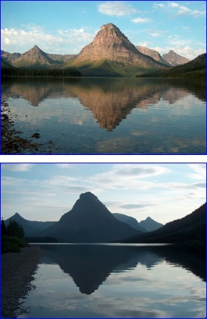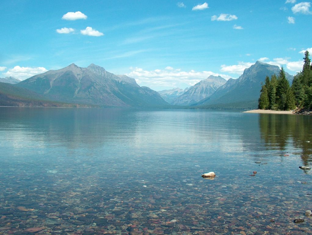 A blue miasma holds the scene within its gentle haze; sky, mountains and water depicted in various shades and tones. Across the undisturbed expanse of the lake, the mountains rise in the distance, their sharp outline highlighted against the sky and reflected in the watery mirror. Nearer to shore, the crystal clarity of the cool water reveals the red and grey rocks resting on the shelf edging the deeper expanse of this glacial gouge. It is a place of stillness and beauty, a place to recharge the soul and be at peace. It is special; Sterling and I met here, on the shores of Lake McDonald in Glacier National Park, Montana.