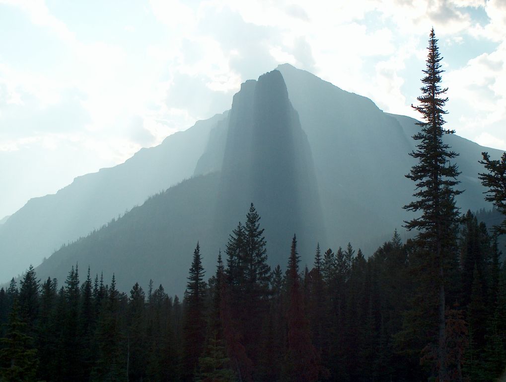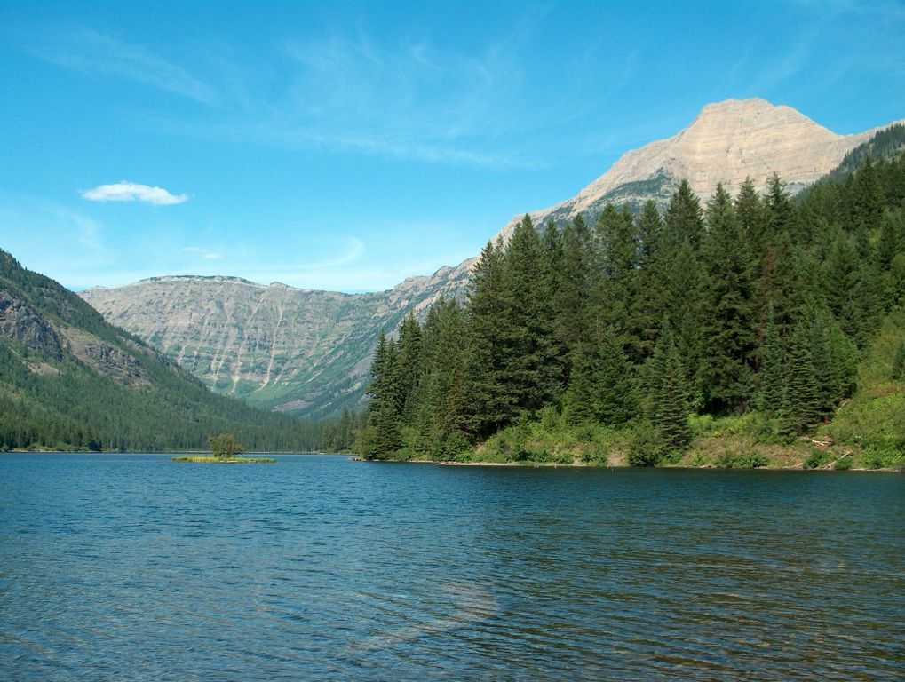 The trail to Upper Two Medicine Lake is a varied path passing through the forested skirts of the mountains, out across sections of low-lying vegetation not far above the shore and then travelling up the valley from the head of the first lake to the toe of the next. Along the inter-lake section, avalanche damage is evident, the massive destructive force of falling snow and ice has left tree trunks snapped like matchsticks, much of the ground cleared for fresh growth.