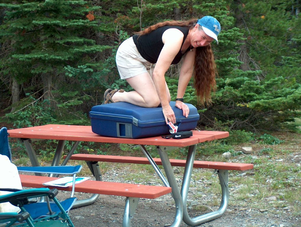 It was about this time that Solanna took up wrestling her suitcase on the picnic table. The origins of her peculiar behaviour have to be put down to the size of the camper. We simply do not have cupboard space to offer visitors and so her luggage had to live in the truck and be brought back and forth as needed.
