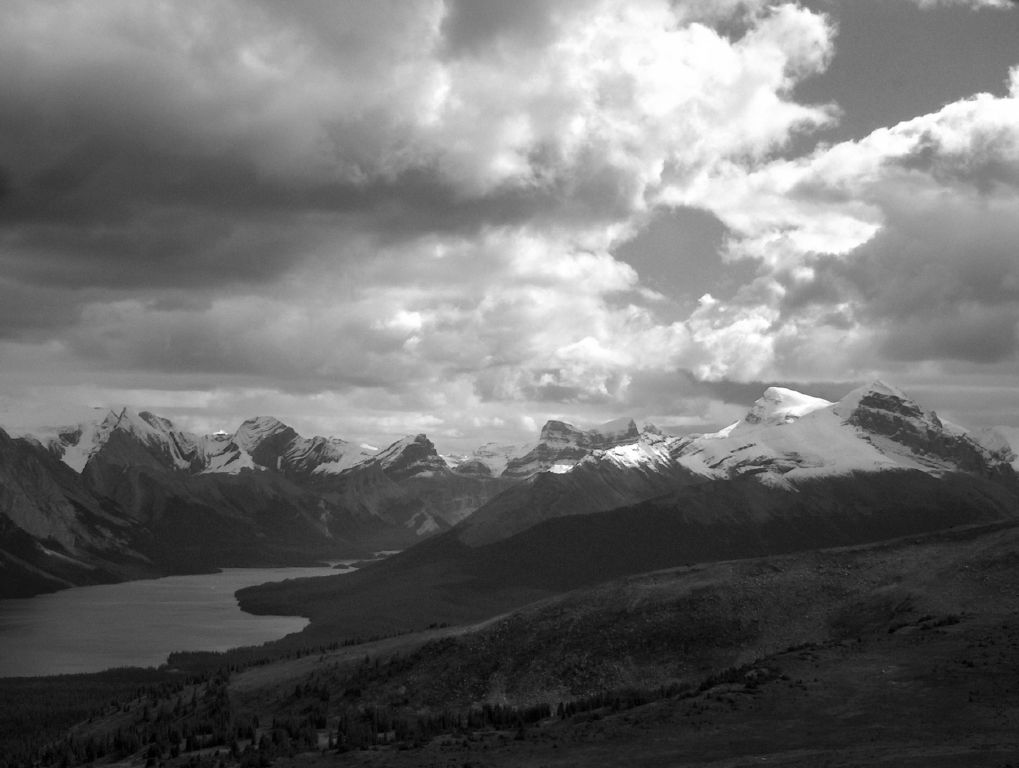 The following day, the clouds loomed and while the waterproofs could have been whisked out at any moment, the forecast was for partly sunny and so we took our chances and set out for Maligne Lake and a trail that would take us up above tree line to a vantage point with views back into the valley. It was a hard uphill slog but in a surprisingly short time we emerged from the trees and struggled up the switch-backing path across loose rock on the south-facing slope of Bare Hill.