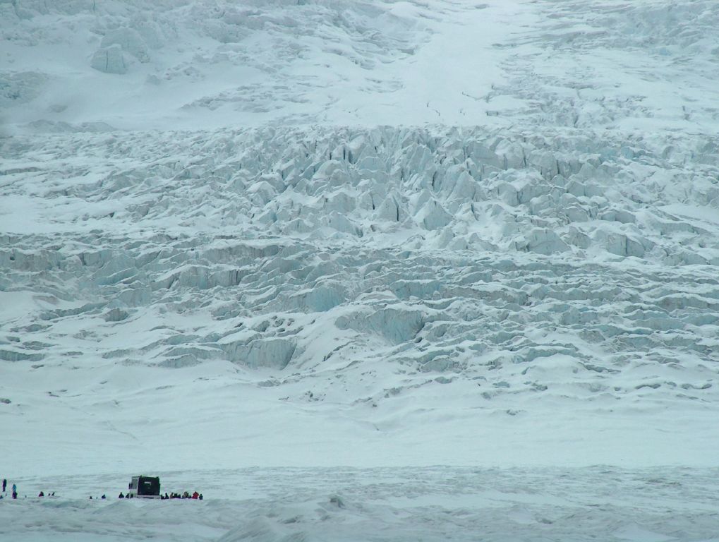 The Athabasca is six kilometers long and one wide; it is several hundred meters at it's deepest. While this may seem impressive it is a shadow of its former self; the glacier is in retreat and the rate at which it is melting is in direct correlation to global warming. The history of glaciers, available through the study of ice cores indicates that the present rate of disappearance is considerably faster than anything experienced over the last hundred and ten thousand years. There is just a hint of irony that the multitude of tour buses driving out across the glacier is using carbon-based fuels, thus adding to the demise of their own source of income.