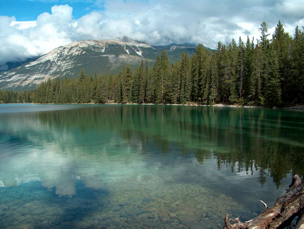 The weather continued to be on the cool, moist side and we woke one morning to huge snowflakes falling ponderously, settling on the trees but unfortunately melting on the warmer ground. At least it was a change from the relentless rain and for a short while we had high hopes that the temperatures might plummet and we would find ourselves in a blanket of snow. In an unusual turn of events the opposite happened; the sky cleared and the sun came out and without a seconds hesitation we set off for Lake Annette and a short afternoon saunter. The area was festooned with cougar warnings, two unusual incidents having alerted concern.