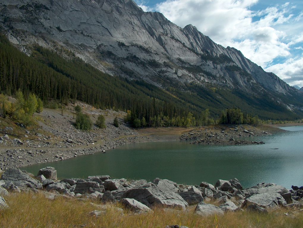 A short distance down the valley from Maligne is the intriguing Medicine Lake. No river visibly flows from it and yet each autumn the water level begins to drop in late August and by October all that is left is a ribbon of flowing water wending its way across the valley floor. Its seasonal nature is the result of the balance between two factors, the volume of melt-water pouring into the lake and the rate of dispersal via narrow underwater sinkholes.