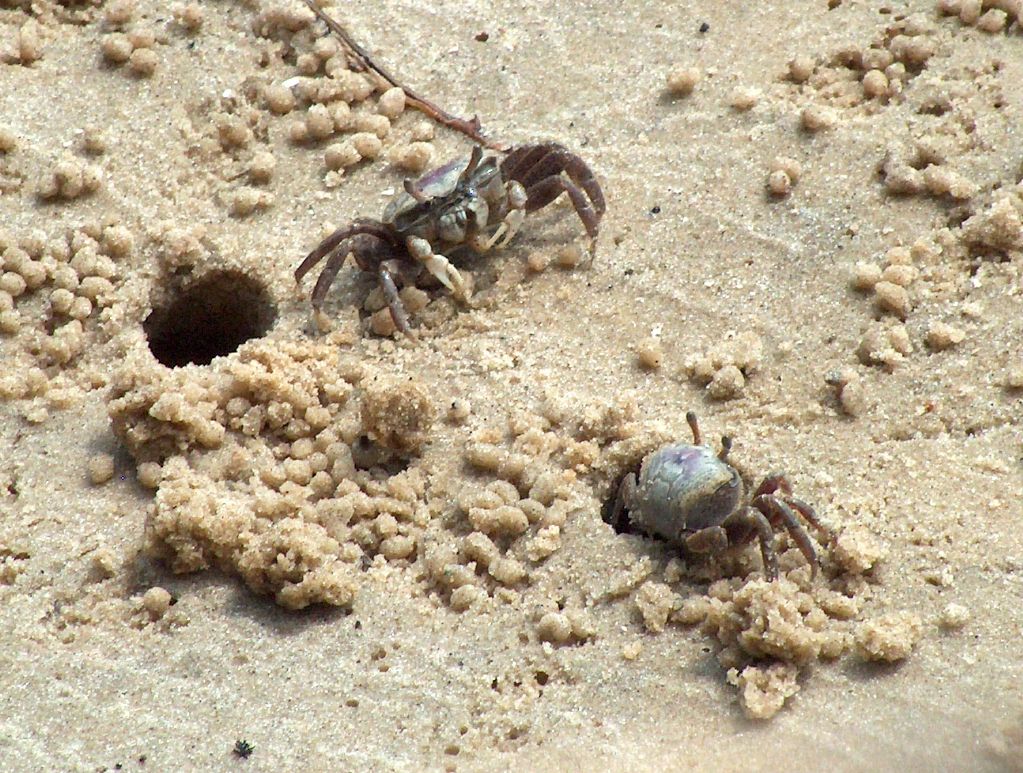 Just inland, a colony of minute Fiddler Crabs freezes in mid-movement as we approach the edge of the lagoon. The ground is pitted with dozens of small holes; tiny balls of sand, debris from the excavation lie littered around. Crabs pose in a still life montage, caught outside the protection of their homes not sure whether we might represent a threat; sight and smell unable to differentiate between heron and human. After a few minutes they cautiously return to the business of the day, the slight blue of their carapace obvious as the sun comes out, the males posturing with their oversized front claw. Mesmerised by this Lilliputian crab world, we watch the comings and goings for some time, occasionally sending them back into their statuesque state with an inadvertent movement.