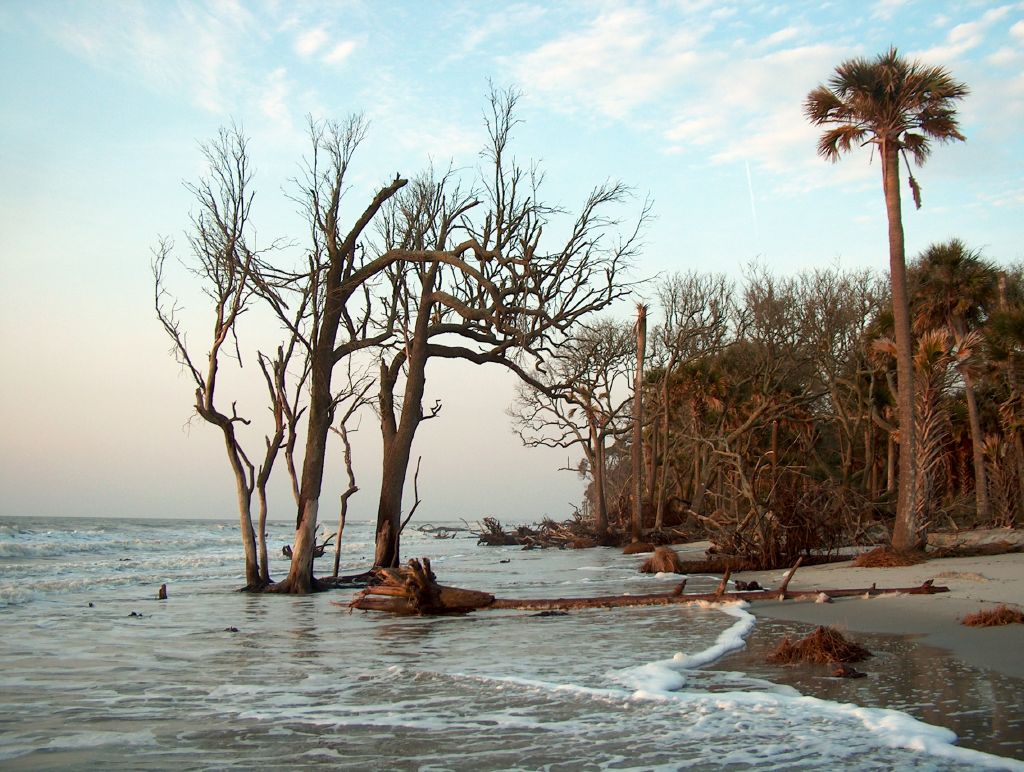 The coast still entices us and at Hunting Island the unremitting advance of the ocean is in evidence. The sea is steadily eating away at this barrier island, the beach disappearing at the startling rate of fifteen feet a year, the mature forest falling under the attack, the campground decidedly threatened.