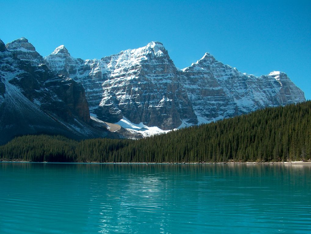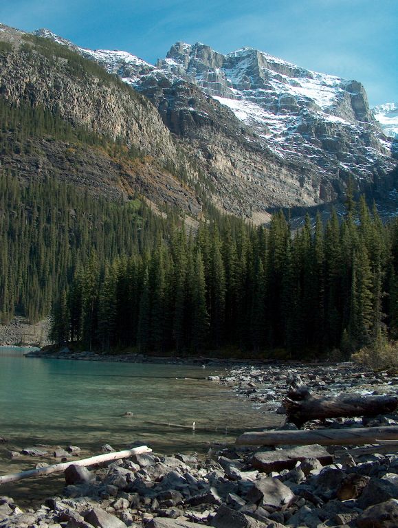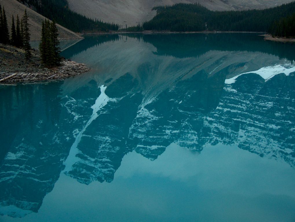 Moraine Lake is probably one of the most recognized landscapes in Canada, appearing on the twenty-dollar note between 1969 and 1979. It sits at the head of the Valley of Ten Peaks, the snow covered pinnacles sweeping in a curved line far above the brilliant turquoise of the lake. The day we went up to Moraine the sun shone with unfamiliar warmth, the sky was a solid rich blue and autumnal tones speckled the slopes beneath the brilliant white of the upper reaches. The small lake is readily accessible by road and so immensely popular, and of course the crowds were out in their droves on such a beautiful day. We rented a canoe and leaving the throng behind glided out onto the remarkable waters, their depths clouded by the minute particles of glacial flour carried down from the ice, the colour even more intense and startling. The dark rock of the surrounding mountains rose immediately from the west shore towering over the tiny boat, the elliptical line of the peaks curving around to the north, nestling glaciers and ice pockets in their folds.