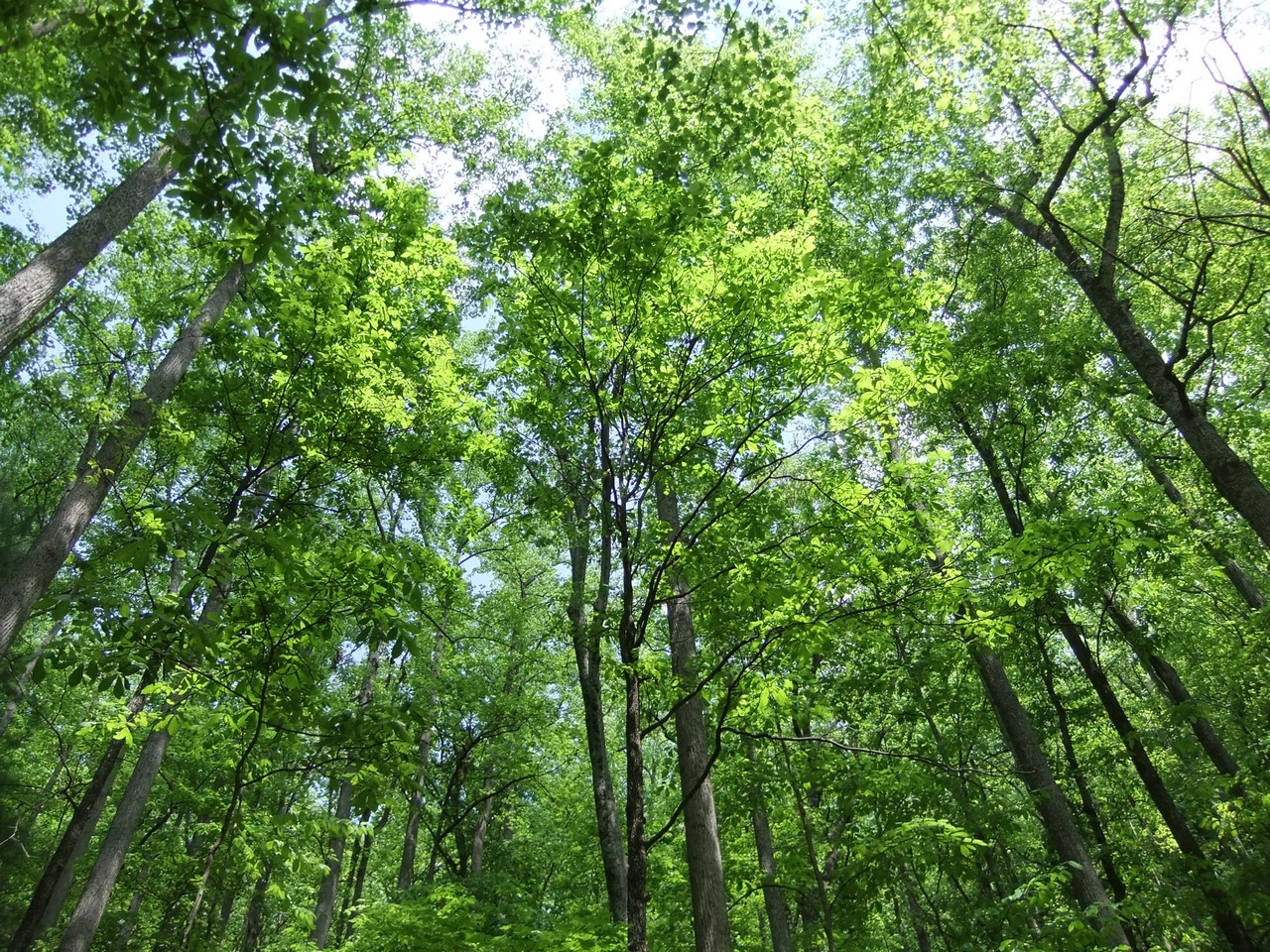 The woodland is a predominantly deciduous forest with tall canopy trees allowing varying degrees of light to feed the layers