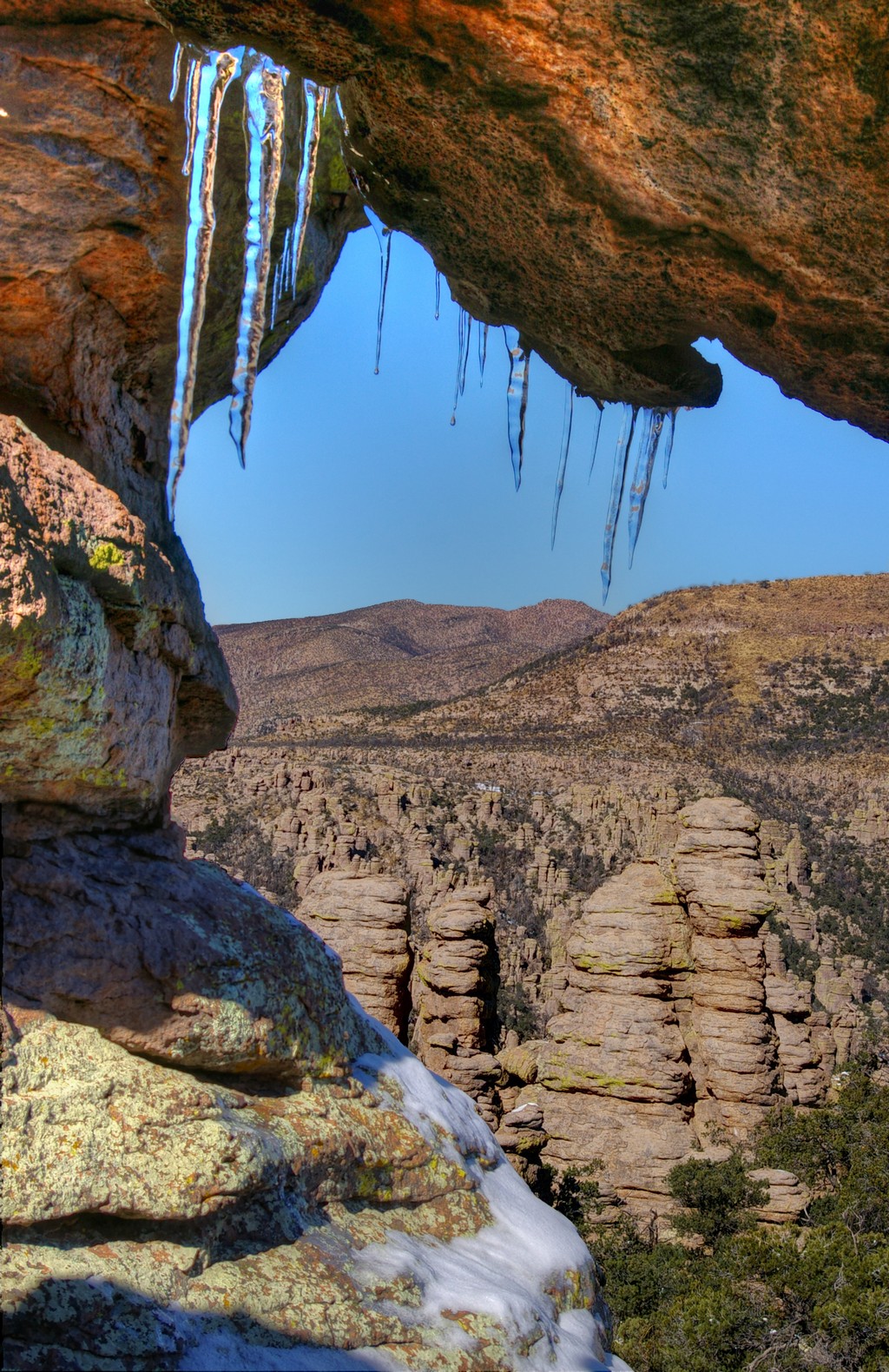 Chiricahua National Monument is tucked in the southeast corner of the state, located in a small mountain range surrounded by pale desert grasslands. We cross the Chiricahua Mountains on one of Sterling’s shortcuts: unpaved, narrow and rutted. The steady drizzle ensures that the camper is filthy by the time we drive back on to paving and of course I’m to blame, being the driver.