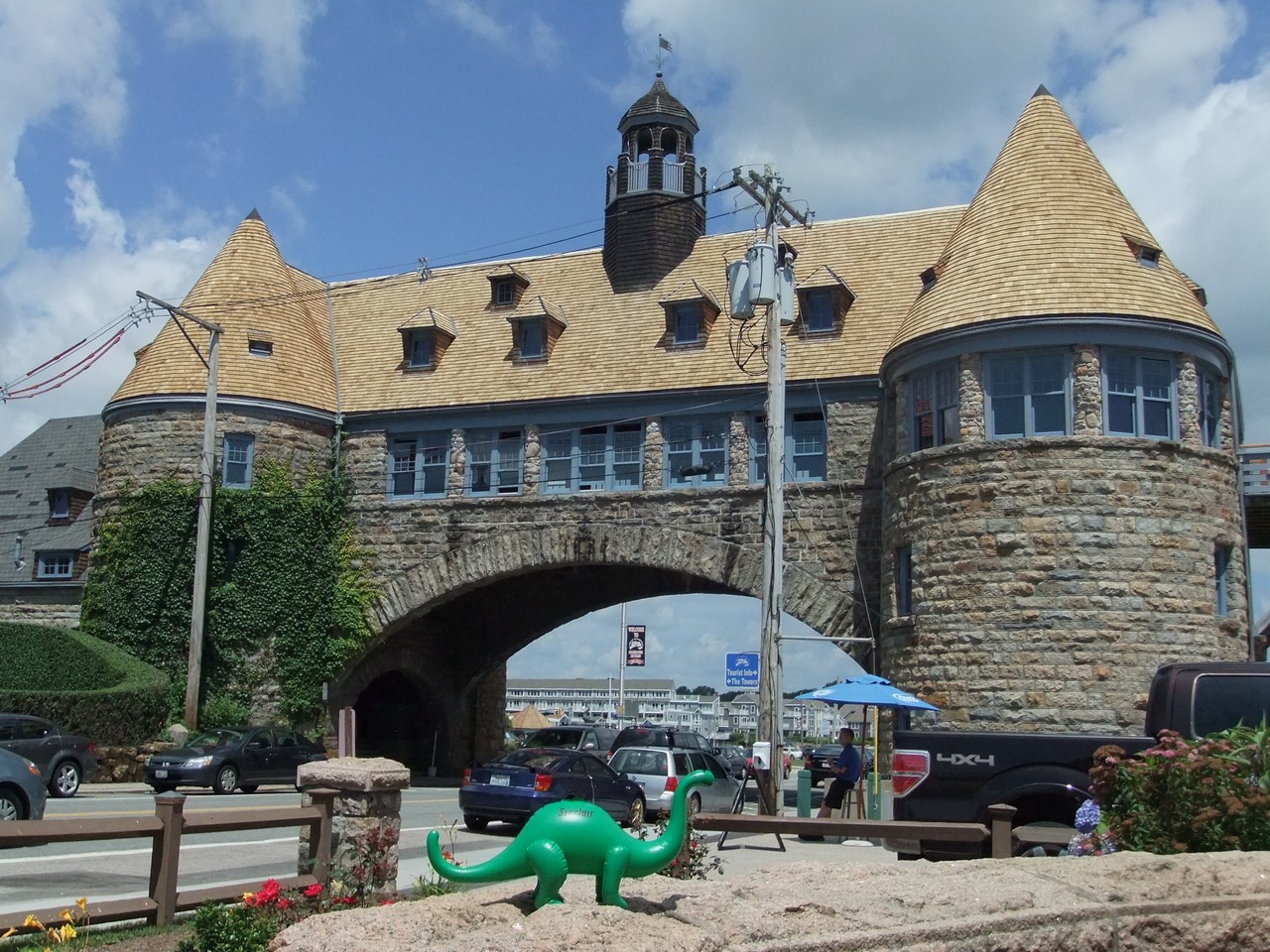 The Towers, Narragansette A significant proportion of the population appear to be on the small beach as we arrive in Narragansett, a town with a long history of attracting tourists. The Narragansett Pier Casino built in the 1880’s was a magnet for the holidaying masses and like any good resort offered a broad range of activities from playing the tables to tennis, bathing or dancing . All that remains of it today is The Towers with their connecting arch bridging the main coastal road through the resort. Something of the architecture is reminiscent of a castle on the Rhine which suggests to me that it may have been a forerunner of today’s themed casinos in Las Vegas.