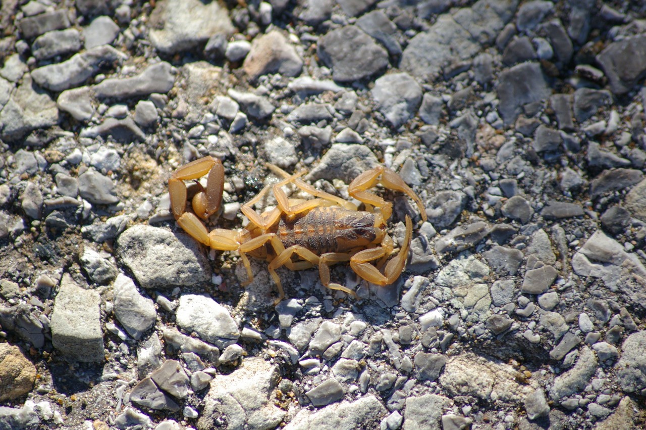 Striped Bark Scorpion In the morning we find a very interesting but much smaller creature hiding amongst our leveling blocks. It’s a scorpion but only just; it’s less than an inch long. The cold morning air makes it disinclined to move, the weak sunlight bringing a translucence to legs and tail, the patterns on the carapace clearly visible. The tail remains at rest; either we’re no threat or it’s too cold for such energetic posturings. It strikes me that the scorpion is always portrayed as one of the threats of the desert west, with a potentially lethal sting and a hint of bad temper leading to unprovoked attacks of innocent people. Reading about these fascinating creatures, the truth appears somewhat different with very few posing a serious danger although that’s not to say you won’t know about it if you are stung.