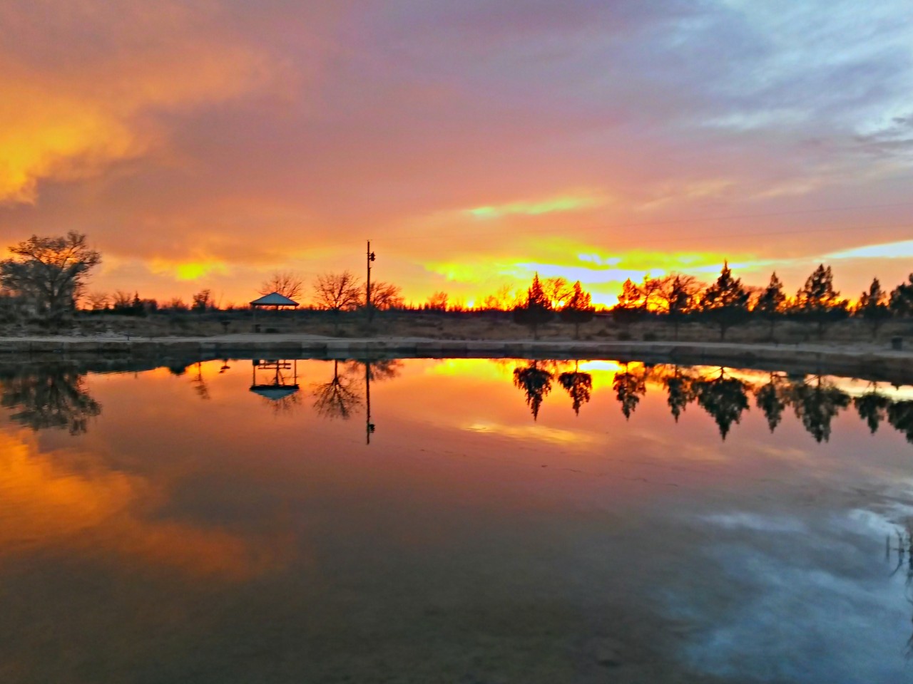 Sunset at Oasis State Park Back on the dog leg, we arrive in New Mexico and settle in near Artesia for a solid block of work before heading northeast to Oasis State Park. The vast expanse of high plain in eastern New Mexico is known as the Llano Estacado and while there is much debate about the origin of the name its flatness cannot be disputed. The park sits at an elevation of four thousand feet, its dry-looking grassland and dunes surrounding a small pond and given its name you would be forgiven for thinking that the lake is the oasis in question. A cursory look quickly undermines that view; the water is clearly contained by an artificial wall and further reading reveals that it was created in 1972 and lined with bentonite clay. Whatever its provenance it is incredibly popular with the locals, who are attracted by the trout and catfish with which the water is stocked. A few short trails meander around the dunes and at sunset the sky illuminates in a startling array of colour, one of the most dramatic such displays we’ve seen in a long time.