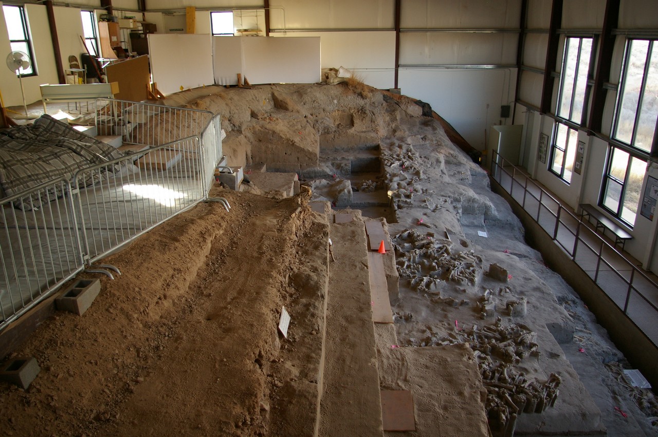 Blackwater Draw Locality #1 We set off on the short self-guided tour of the site and although we know the significance of the place much of the walk is of little obvious interest. This changes when we arrive at a large building erected to protect an amazing density of pleistocene animal bones. The hillside covered by the shed has been terraced, the excavations revealing various clusters of skeletons in situ. It reminds us of a similar display at Dinosaur National Monument although admittedly those bones are another order of magnitude larger (and several orders older).