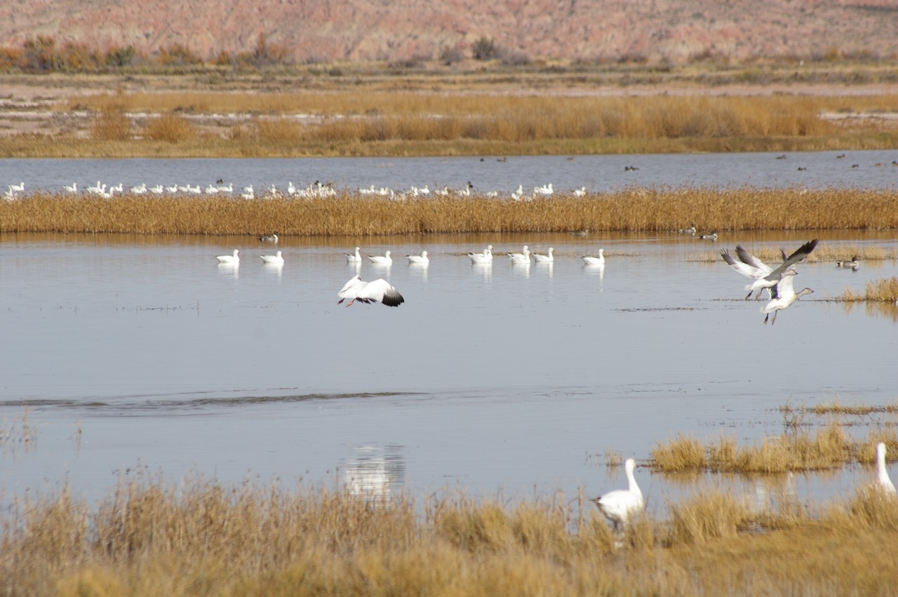 Further up the Pecos and with the escarpment still visible is the Bitter Lake National Wildlife Reserve. Sandhill Cranes and Snow Geese arrive here in their thousands during the winter and they are already making their presence felt. Access is limited and although there is a dirt road around the unit and one or two hides, it is difficult to get very close to the main attraction. We’d have to spend a great deal more on our binoculars and camera before we could get a better look and the photos we’d like. In spite of these limitations, huge groups of cranes moving in synchronicity, their long elegant necks repeating the same curve throughout the flock is a sight worth seeing, while the snow geese blanket the water, small groups taking to the wing at the slightest provocation.