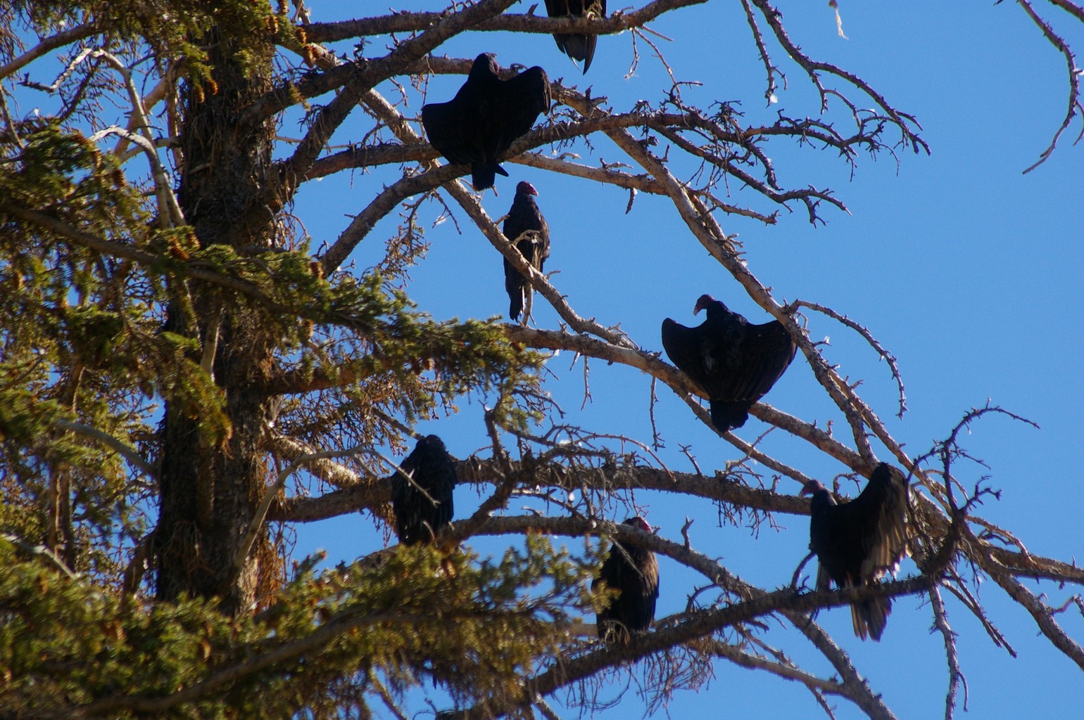 We’ve been travelling across the southern part of Colorado, with numerous stops along the way. Early morning, in the small town of Del Norte, we spy a tree full of Turkey Vultures, their wings spread, apparently sunning themselves. A little research, on our friend Google, reveals that UV kills the bacteria that builds up on their wings and beak due to their dining on meat that's not overly fresh.
