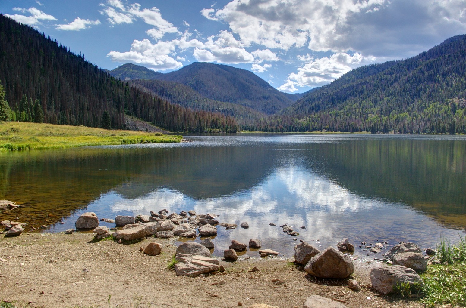 Trees in the campground or not, it’s still a beautiful place. Big Meadows reservoir sits in a basin, the surrounding slopes mirrored in the water. A trail follows the shore and climbs up one of the feed valleys and we allow ourselves a couple of hours off the keyboards before we leave, heading for Pagosa Springs.