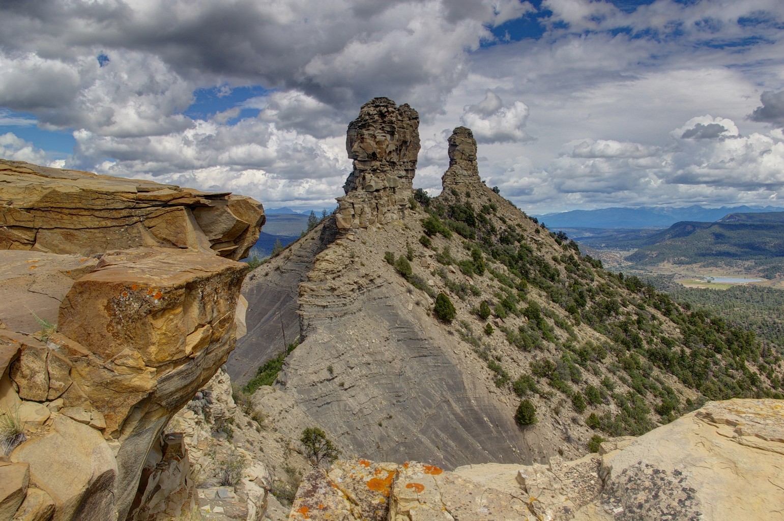 We’re now heading towards an area rich in the archeological remains of the Ancestral Puebloan people who populated this area from about 550 CE to the late 1200s. Our first stop is at Chimney Rock National Monument, the site of an outlying settlement of the Chacoan culture. It’s an unusual part of the park system: it receives no federal funding and is operated by volunteers. Great House Pueblo is only accessible on a guided tour and sits on a fin of land, the end of which overlooks Chimney Rock and its Companion Rock. It has been proposed that the location is no mistake: at the Northern Major Lunar Standstill the moon rises between the two rocks.