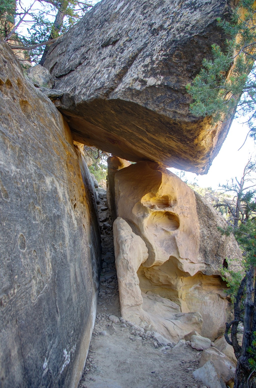 Leaving Spruce Tree House we set off on the Petroglyph Point Trail and amble at a very leisurely pace on this wonderful varied path. The outward section follows ledges along the cliff face, squeezing through narrow passes, following sections of steps laid or hewn by the CCC and offering a wonderful closeup look at the delightful shapes eroded in the sandstone. The petroglyph panel for which the trail is named is understood by modern day Hopi to represent the story of the people’s emergence from the earth and their migration from that point, various clans splitting off along the way. From the panel, the trail climbs back to the mesa top and from there, on the cliff top, back along the canyon.
