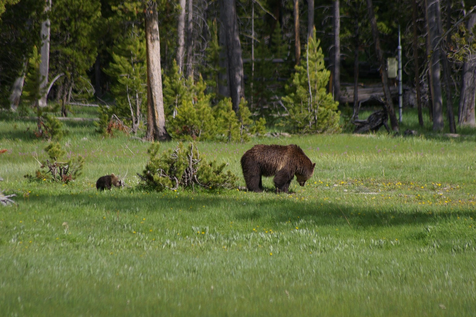 Driving home one afternoon we fight our way through such a congestion, inching past on-coming tour buses, narrowly missing protruding mirrors, opening doors and people crossing with little regard for vehicles still on the move. As I attempt to remain calm and avoid any collisions Sterling manages to snap a few shots of the grizzly and cub. They're too far off even for our telephoto lens and we are set to jonesing for a better one.