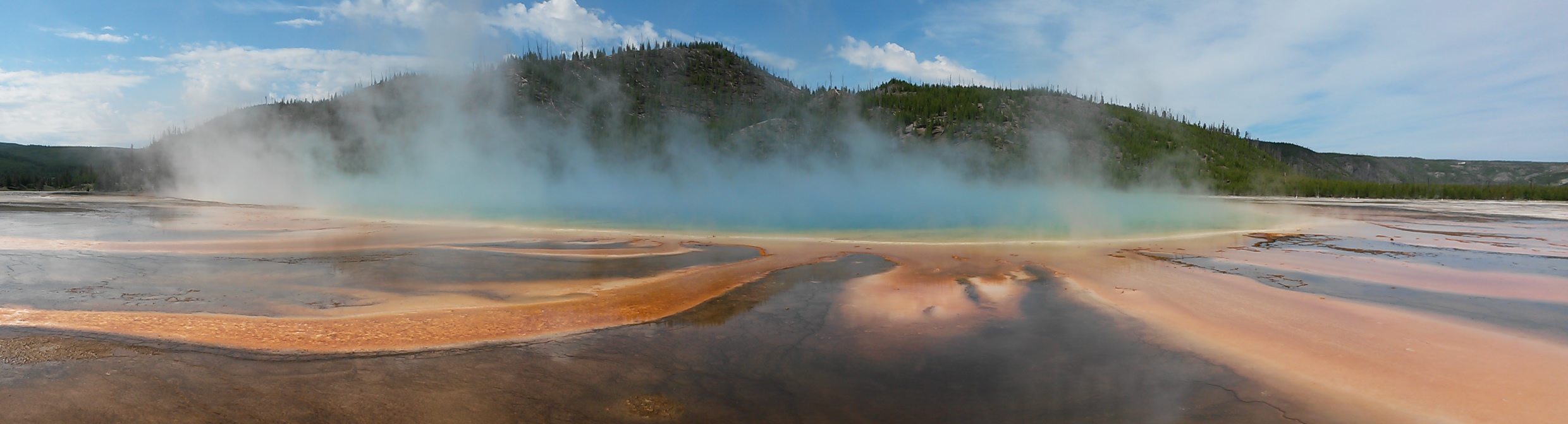Of all the wonderful aspects of the park, the Grand Prismatic Spring stands out. The bright orange curves and swirls emanating from the yellow edged vivid blues of the pool are stunning, the richness of the water colour reflected in the steam rising from its surface. We lose ourselves in the stunning colours and shapes, overwhelmed by the beauty.