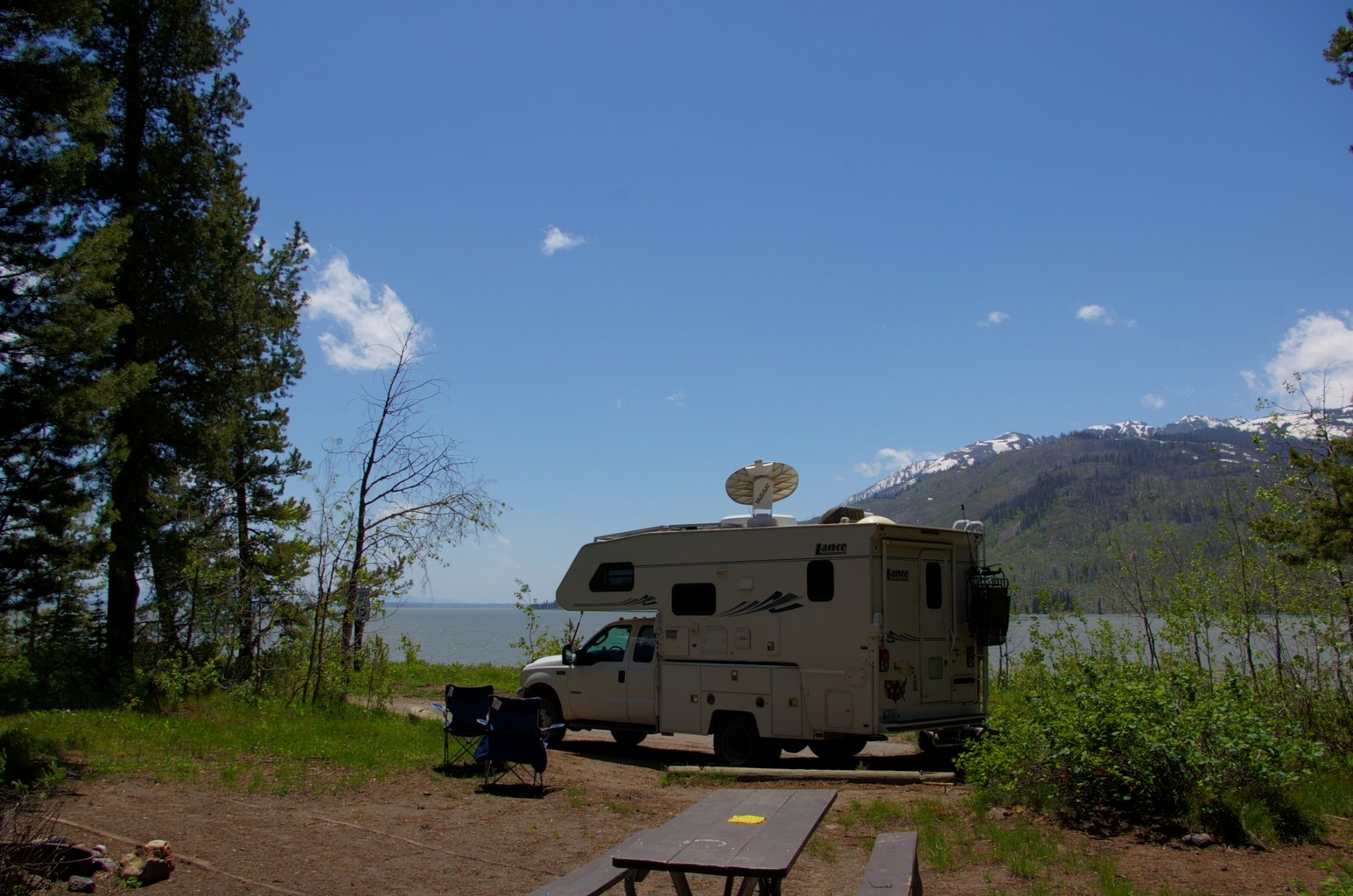 Summer in the States conjures up images of heat, sunshine and summer clothing. That is unless you're in Grand Teton National Park at an altitude of nearly 7,000 feet: we woke this morning to a snow shower followed by hail bouncing off the roof of the camper. A couple of nights ago we had a low of 23F (-5C). Today the daytime temperature is hovering around 40F (4.5C) and although that wouldn't be too bad in the autumn I take exception to it in mid-June. The thermal underwear is back out, the fleeces back on and the furnace kicking in repeatedly as it attempts to keep us warm. If you're tempted to think I'm a wimp, you'd probably be not too far off the mark. I just want the opportunity to sit outside in the warmth with a cold beer at the end of a day's work. Maybe it's time for lower altitudes south of here. I shouldn't complain, the forecast is for warmer, drier weather and we have already enjoyed a few bright clear days in the park.