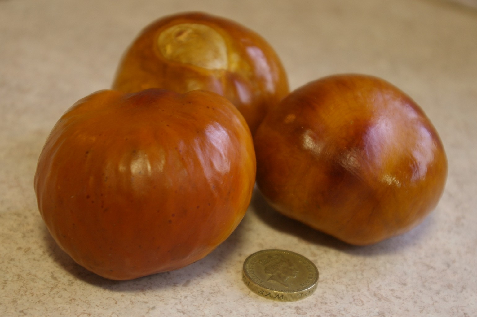 In Britain at this time of year, conkers are thick on the ground, dropping from the Horse Chestnut Trees. The shiny brown seeds are a much prized possession of childhood and the aftermath of a good autumnal wind is always greeted with the anticipation of finding these treasures. Some children gather them to play a traditional game where two opponents, each with a conker on a string, take turns striking the other’s conker until one breaks apart. Others collect them simply because they are beautiful when they first emerge from their thick, spiky shells.