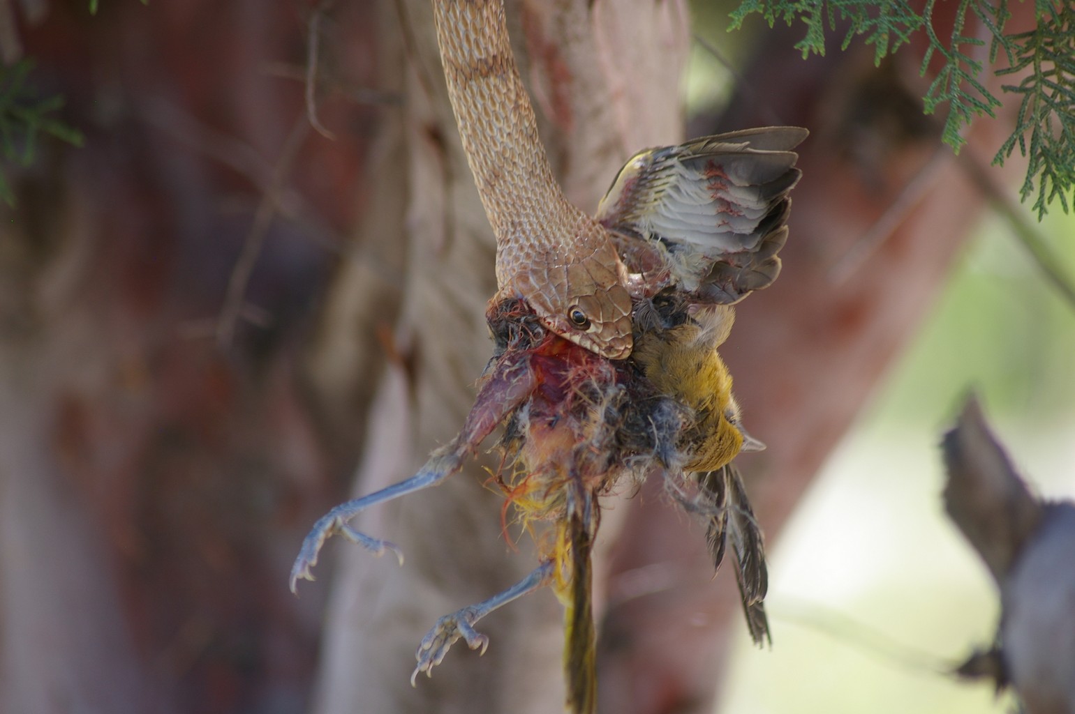 We had been told that the dramatic rabbit numbers were likely to prompt an increase in the snake population, and while bunny sized snacks were readily available the only real reptilian action that we saw was in a tree. The photographs tell the story and without going into all the gory details, it involved a Western Kingbird (about the size of a blackbird) and a Western Coachwhip. The Coachwhip is not a venomous snake and while it was clear early on that the bird wasn’t likely to get free, it was a long drawn-out process. Numerous Orioles and other Kingbirds mocked the snake but to no effect, the hapless bird was firmly clenched in its mouth. The snake didn’t let go until the bird was dead. As the prey fell to the ground, the Coachwhip slithered down the trunk and searched the area beneath the tree. Having located the bird, the snake made off into the undergrowth to enjoy its lunch in peace, away from our prying eyes.