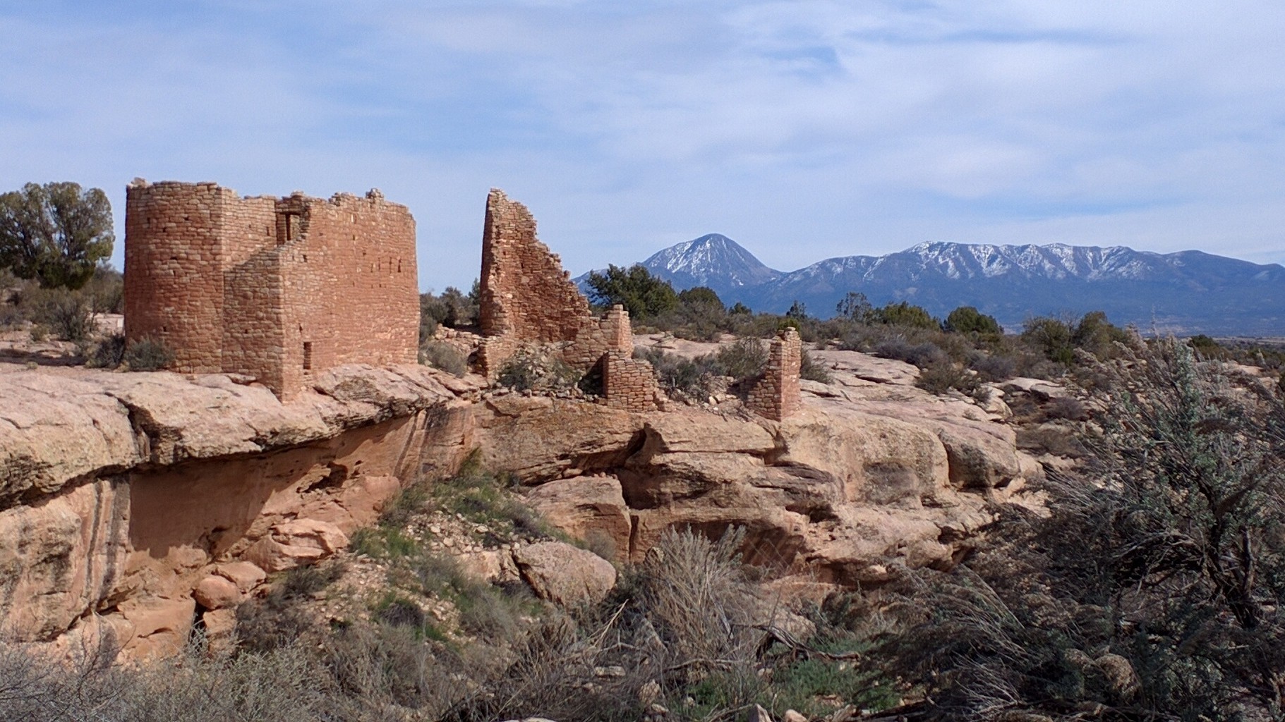 Hovenweep's towers, grouped around a canyon head make it a very particular site. Buildings stand right on the canyon edge, some isolated from the rim on top of huge boulders, a few down on the canyon floor. Sleeping Ute Mountain lies in the background slightly dusted in his scanty spring blanket of snow.